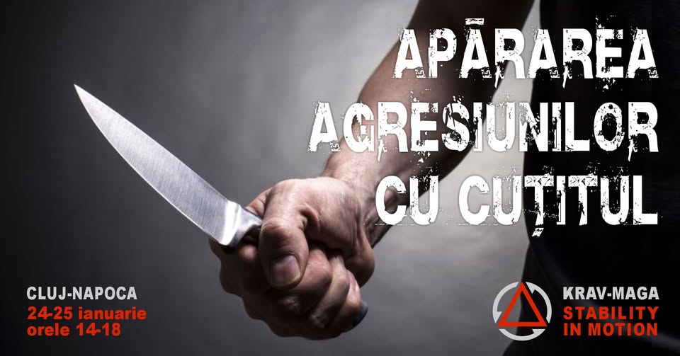 Apărarea Agresiunilor cu Cuțitul - soluții reale, care chiar funcționează - ediția 7 este un workshop practic de autoapărare Krav-Maga, organizat la școala Krav-Maga Stability in Motion din Cluj-Napoca. Participanții vor exersa tehnici reale și eficiente de apărare împotriva atacurilor cu cuțitul, învățând mișcări scurte, rapide și precise orientate spre zonele sensibile ale agresorului. Sesiunea include demonstrații, exerciții practice și simulări realiste pentru a dezvolta reflexe automate în situații critice. Evenimentul este destinat **tuturor nivelurilor**, de la începători la practicanti avansați, inclusiv femei, bărbați și persoane preocupate de siguranța personală. Veți învăța să evitați conflictele, să rămâneți calmi sub presiune și să neutralizați amenințări cu încredere, bazat pe principiile fondatorului Imi Lichtenfeld. Nu sunt necesare experiențe anterioare, dar se recomandă îmbrăcăminte sport confortabilă și pantofi potriviți pentru mișcare. Workshop-ul este găzduit de **Krav-Maga Stability in Motion**, școala cu tradiție din 2003 în Cluj-Napoca, condusă de instructorul László Pethő, primul instructor de Krav-Maga din România cu centură neagră și peste 22 ani experiență. Locația: Calea Florești 3/26, Cluj-Napoca. Data: 24 ianuarie 2026, ora 18:00. Înscrierile se fac prin site-ul krav-maga.ro; verificați disponibilitatea locurilor.