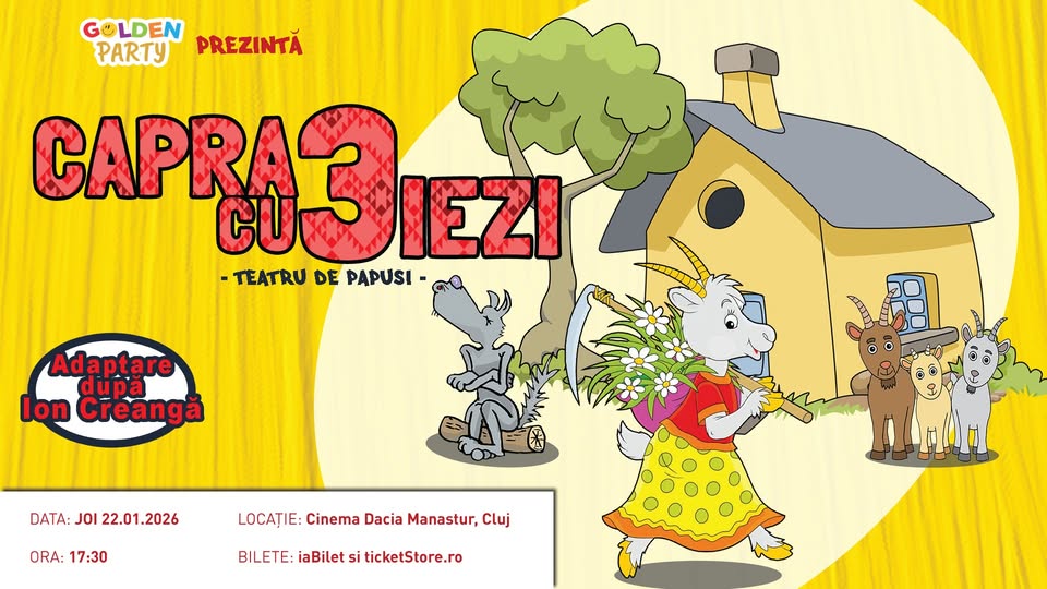 Spectacolul „Capra cu 3 iezi” este o adaptare fidelă a celebrei povești de Ion Creangă, pusă în scenă în stilul clasic al teatrului de păpuși la paravan. Capra își lasă cei trei iezi singuri acasă, iar vicleanul lup încearcă să-i păcălească pentru a-i mânca. Povestea explorează teme reale precum curajul, istețimea și legătura familială, captivând generații întregi de copii prin detaliile vii și moralele profunde. Recomandat copiilor peste 2 ani, spectacolul durează 45 de minute și este jucat de trupa FUNtasticii Cluj Napoca, în regia Sabinei Arsenie. Deși prezintă momente intense cu lupul rău, nu este excesiv de înfricoșător, dar părinții ar trebui să evalueze sensibilitatea celor foarte mici. Este ideal pentru 3-8 ani, oferind o experiență captivantă fără violență grafică. După spectacol, urmează 15 minute de activități interactive: muzică, dans, baloane de săpun, invitați surpriză în costum și opțional face painting. Copiii se vor bucura de joacă împreună cu actorii, creând amintiri de neuitat și transformând ieșirea la teatru într-o petrecere veselă.
