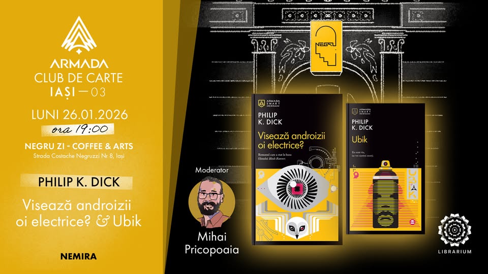 Club de Carte Armada Iași #3 este un eveniment dedicat pasionaților de literatură science-fiction, unde participanții se vor aduna pentru a discuta cele două romane iconice ale lui Philip K. Dick: „Ubik” și „Visează androizii oi electrice?”. Vor analiza temele profunde precum realitatea alterată, identitatea umană și viitorul tehnologic, împărtășind impresii, interpretări și dezbateri captivante într-o atmosferă relaxată. Evenimentul este ideal pentru iubitorii de SF, cititori începători sau avansați, studenți, profesioniști și oricine dorește să exploreze universul dickian. Participanții vor învăța despre stilul inovator al autorului, vor descoperi conexiuni între cele două opere și vor experimenta bucuria discuțiilor literare, stimulând gândirea critică și imaginația. Organizat de Clubul de Carte Armada, evenimentul are loc luni, 26 ianuarie 2026, ora 19:00, la Negru Zi - coffee & arts, Iași. Intrare liberă, recomandăm să citiți cărțile în prealabil. Nu sunt necesare înscrieri, veniți cu o băutură sau gustare dacă doriți.