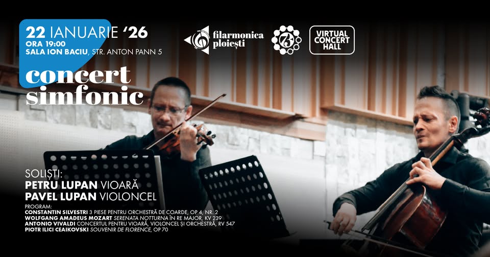 Concertul Simfonic de la Filarmonica Paul Constantinescu din Ploiești, Sala Ion Baciu, pe 22 ianuarie 2026, orele 19:00, aduce pe scenă un program captivant interpretat de Orchestra Filarmonicii, cu soliști excepționali: frații Petru Lupan la vioară și Pavel Lupan la violoncel. Repertoriul include piese remarcabile precum cele Trei piese pentru orchestră de coarde de Constantin Silvestri, Serenata Notturnă în Re major KV 239 de Wolfgang Amadeus Mozart, Concertul pentru vioară, violoncel și orchestră RV 547 de Antonio Vivaldi și Souvenir de Florence op. 70 de Piotr Ilici Ceaikovski. Această seară muzicală promite o experiență inedită prin virtuozitatea fraților Lupan, care vor interpreta cu pasiune lucrări baroce și romantice, evidențiind armonia perfectă dintre vioară și violoncel. Sub bagheta orchestrei filarmonicii, publicul va descoperi nuanțe subtile ale muzicii clasice, de la eleganta serenadă mozartiană la energia vibrantă a concertului vivaldian. Merită să participați pentru calitatea excepțională a interpretării, raritatea programului care celebrează talente românești alături de maeștri universali și atmosfera intimă a Sălii Ion Baciu. Este o ocazie unică de a savura muzică live de înaltă clasă, transmisă și online prin Virtual Concert Hall.[2][7]