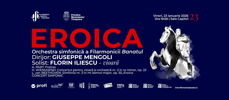 Concertul **Eroica** de la Sala Capitol din Timișoara, pe 23 ianuarie 2026, celebrează Simfonia nr. 3 „Eroica” de Ludwig van Beethoven, o capodoperă a muzicii clasice care marchează trecerea de la clasicism la romantism. Această lucrare monumentală, compusă în 1804, evocă eroismul și lupta interioară, fiind dedicată inițial lui Napoleon Bonaparte, dar apoi retrasă de Beethoven în gest de protest. Programul va include probabil această simfonie interpretată de Orchestra simfonică a Filarmonicii Banatul, renumită pentru calitatea sa artistică și colaborări internaționale. Sub bagheta unui dirijor de prestigiu, precum cei invitați frecvent la Sala Capitol (ex. Levente Török sau Rumon Gamba în sezoanele anterioare), orchestra va reda cu pasiune cele patru părți ale simfoniei: Allegro con brio, Marcia funebre, Scherzo și Finale. Evenimentul face parte din seria de concerte simfonice de înaltă clasă organizate de Filarmonica Banatul, într-un spațiu acustic excepțional.[2] Merită să participați pentru intensitatea emoțională a muzicii lui Beethoven, o experiență transformatoare care combină forța orchestrală cu profunzime filozofică. Sala Capitol, gazda multor evenimente clasice de succes, oferă o atmosferă intimă și elegantă, ideală pentru iubitorii muzicii. Nu ratați această ocazie unică de a asculta **Eroica** live, un eveniment care promite să vă inspire și să vă emoționeze profund.