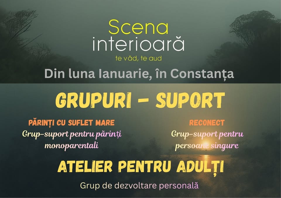 Grupuri-Suport și Atelier pentru Adulți este un eveniment de tip atelier și educație emoțională, unde participanții vor participa la sesiuni de suport de grup și activități practice interactive. Aceștia vor discuta deschis despre provocările personale, vor explora resurse interioare prin exerciții ghidate și vor dezvolta abilități esențiale pentru o viață mai împlinită. Evenimentul combină elemente de reflecție colectivă cu tehnici practice de auto-dezvoltare. Evenimentul se adresează adulților care doresc să aducă schimbări pozitive în viața lor, începând de la **începători** în dezvoltare personală până la cei cu experiență, fără a necesita pregătiri anterioare. Participanții vor învăța să-și identifice emoțiile, să gestioneze stresul și să construiască relații sănătoase, experimentând un mediu sigur și empatic de creștere personală. Evenimentul este găzduit de organizatori specializați în educație și suport psihologic, la Tomis III, Constanța, pe 20 ianuarie 2026, ora 18:00. Intrarea este liberă, durata aproximativă 2-3 ore. Vă recomandăm să veniți cu o minte deschisă; nu sunt necesare materiale suplimentare. Pentru detalii, consultați onevent.ro.