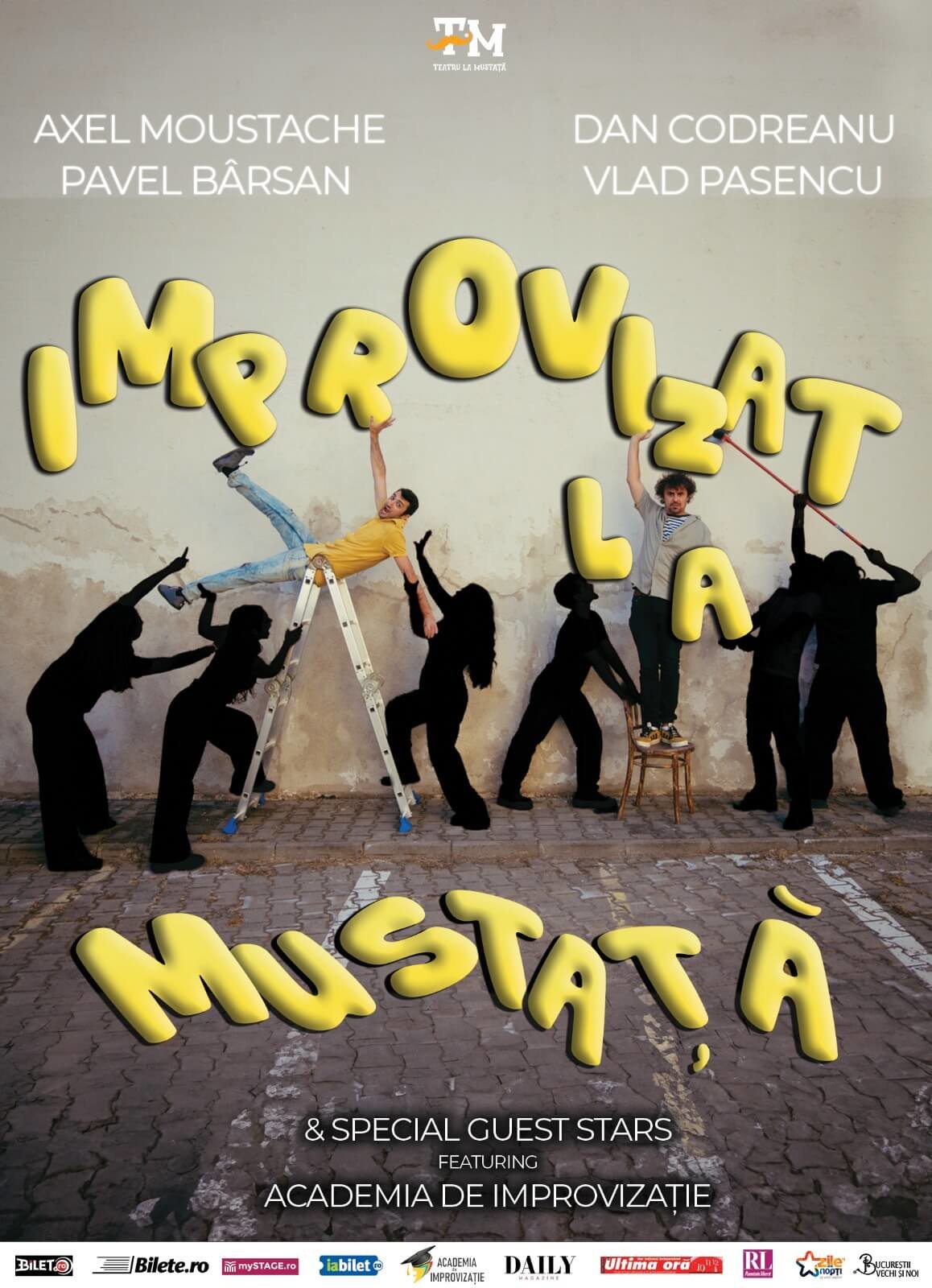 „Improvizat... La Mustață!” este un spectacol de improvizație teatrală plin de umor și spontaneitate, unde nimic nu este pregătit în prealabil, dar totul devine posibil pe scenă. Publicul devine parte activă, sugerând teme, personaje sau situații neașteptate, iar actorii creează pe loc povești hilare, scenete și dialoguri savuroase. Fiecare reprezentație este unică, bazată pe interacțiunea directă cu sala, transformând sala de teatru într-un spațiu de creație colectivă plină de râsete și surprize. Spectacolul este susținut de o echipă talentată de improvizație: Axel Moustache, Dan Codreanu, Pavel Bârsan și Vlad Pasencu, completată de invitați surpriză – de fiecare dată o personalitate diferită din lumea artistică sau nu. Creat în stilul „Teatru la Mustață”, este regizat și coordonat de această trupă renumită pentru umorul lor ireverențios, fără un autor tradițional, ci bazat pe talentul improvizatorilor. Ceea ce face spectacolul special este formatul său imprevizibil, care garantează o experiență proaspătă de fiecare dată, apreciat pentru energia debordantă și capacitatea de a stârni hohote de râs. Critica și publicul l-au aclamat ca un „must-see” al teatrului bucureștean contemporan, evidențiind chimia excepțională a distribuției și inovația improvizației la Teatrul Amzei.