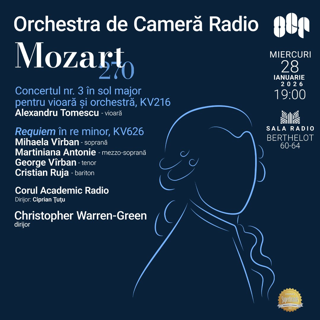Mozart 270 - Requiem - OCR este un concert special dedicat aniversării a 270 de ani de la nașterea lui Wolfgang Amadeus Mozart, marcat de Sala Radio prin două concerte excepționale. Evenimentul prezintă Orchestra de Cameră Radio sub dirijoria lui Christopher Warren-Green, care va interpreta Concertul nr. 3 în sol major pentru vioară și orchestră (KV 216) cu solistul Alexandru Tomescu, urmat de Requiem în re minor (KV 626), una dintre cele mai importante lucrări corale ale muzicii clasice. Requiem-ul va fi interpretat de o distribuție vocală de excepție, cu soprana Mihaela Vîrban, mezzo-soprana Martiniana Antonie, tenorul George Vîrban și baritonul Cristian Ruja, susținuți de Corul Academic Radio sub dirijoria lui Ciprian Țuțu. Această combinație de soliști vocali de renume și cor academic creează o atmosferă solemn-spirituală, caracteristică acestei capodopere mozartiene. Concertul merită vizionat pentru oportunitatea de a experimenta una dintre cele mai profunde și emoționante creații ale lui Mozart, interpretată de muzicieni de clasă mondială în cadrul unei săli de concert prestigioase. Este o ocazie rară de a asculta Requiem-ul într-o formație camerală, care pune în evidență detaliile și nuanțele acestei lucrări magistrale.