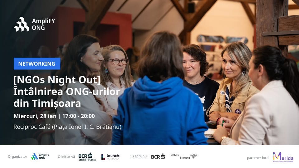 NGOs Night Out - Întâlnirea ONG-urilor din Timișoara este un eveniment de **networking** dedicat organizațiilor neguvernamentale, unde participanții vor schimba idei, vor discuta proiecte comune și vor stabili parteneriate. La data de 28 ianuarie 2026, de la ora 18:00, la Reciproc din Timișoara, ONG-urile vor prezenta activitățile lor, vor organiza sesiuni informale de conversație și vor explora oportunități de colaborare în beneficiul comunității locale. Evenimentul este destinat **reprezentanților ONG-urilor, voluntarilor, activiștilor și profesioniștilor din sectorul non-profit**, începând de la începători până la cei experimentați. Participanții vor învăța despre cele mai recente tendințe în activism civic, vor descoperi noi proiecte de voluntariat și vor experimenta conexiuni autentice care pot duce la inițiative comune. Este o ocazie ideală pentru a-ți extinde rețeaua și a obține inspirație pentru viitoare acțiuni sociale. Evenimentul este **organizată de Fundația Județeană pentru Tineret Timiș (FITT) și parteneri locali**, în spațiul prietenos Reciproc Café din Piața Ionel I. C. Brătianu. Intrarea este gratuită, nu sunt necesare înscrieri prealabile, dar se recomandă să veniți cu vizit carte de vizită sau detalii despre ONG-ul vostru. Parcare disponibilă în zonă, accesibil cu transportul în comun.