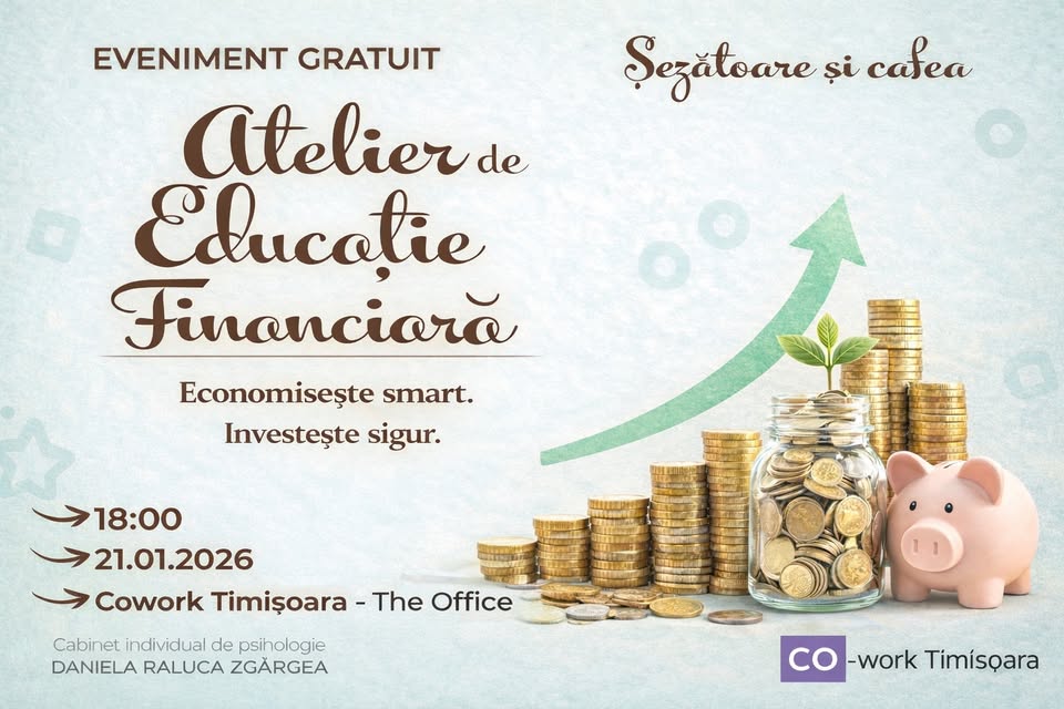 Șezătoarea și Cafea - Atelier de Educație Financiară - Economisește Smart. Investește Sigur #2 este un atelier interactiv care combină educația financiară cu o atmosferă relaxantă de șezătoare, unde participanții vor discuta și învăța practici sănătoase de gestionare a banilor. Veți explora strategii simple de economisire și investiții sigure, prin exerciții practice, discuții de grup și exemple reale, totul însoțit de cafea și interacțiune comunitară.[ ]Evenimentul este destinat în special începătorilor, tinerilor profesioniști și oricui dorește să învețe să-și protejeze viitorul financiar fără complicații inutile. Participanții vor dobândi cunoștințe esențiale despre bugetare inteligentă, evitarea capcanelor financiare și investiții cu risc minim, câștigând încredere în deciziile lor monetare. Nu sunt necesare cunoștințe prealabile, doar entuziasm și un caiet pentru notițe.[ ]Atelierul este organizat de comunitatea „Șezătoare și Cafea”, în parteneriat cu Cowork Timișoara, la Calea Aradului nr. 11, în clădirea BCR, Timișoara, pe 21 ianuarie 2026, ora 18:00. Accesul este gratuit sau la preț accesibil (verificați pe onevent.ro), durata aproximativ 2 ore. Veniți cu mintea deschisă și poftă de cafea![3][4]