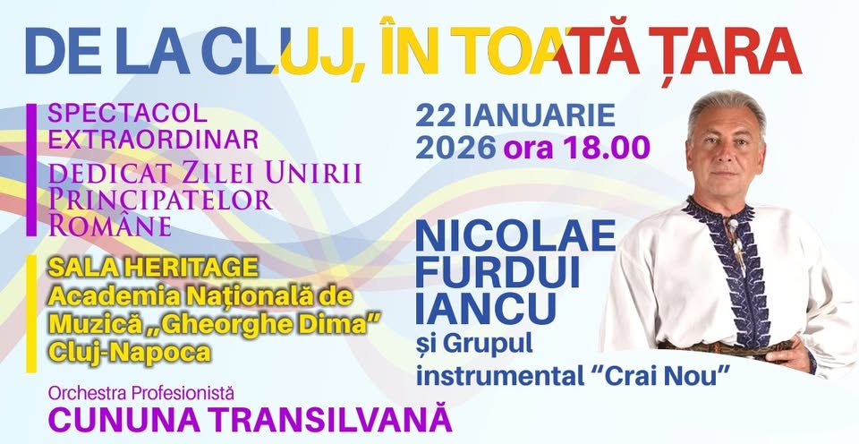 Spectacol Extraordinar - De La Cluj, În Toată Țara este o manifestare culturală de gală dedicată Zilei Unirii Principatelor Române, care reunește pe scenă artiști de renume și tineri interpreți clujeni. Publicul va putea urmări evoluții ale Nicolae Furdui Iancu alături de Grupul instrumental "Crai Nou", acompaniați de Orchestra Profesionistă "Cununa Transilvană" sub bagheta dirijorului Tudor Căucean, oferind o experiență autentic românească prin muzică și tradiție. Evenimentul se adresează tuturor iubitorilor de cultură și tradiții românești, indiferent de vârstă sau nivel de cunoștințe. Spectacolul propune publicului clujean un prilej de întâlnire cu valorile care definesc identitatea națională, completat de Ansamblul Folcloric "Cununa Apusenilor" și Grupul "Tradiții Ormănene", creând o celebrare a identității și valorilor românești. Evenimentul este organizat de Consiliul Județean Cluj, prin Centrul de Cultură și Artă "Tradiții Clujene", în parteneriat cu Asociația "Produs de Cluj" și Radio Cluj. Spectacolul va avea loc joi, 22 ianuarie 2026, de la ora 18:00, în Sala Heritage a Academiei Naționale de Muzică "Gheorghe Dima", strada Bucium nr. 2, Cluj-Napoca.
