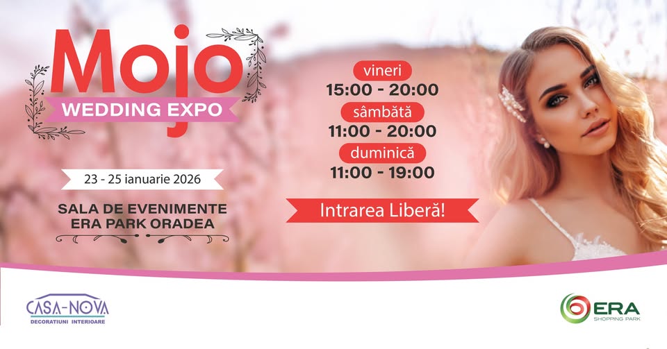 Târgul de nunți MOJO Wedding Expo reunește cei mai talentați furnizori din industria nunților, inclusiv designeri de rochii de mireasă, costume pentru mire, organizatori de evenimente, fotografi profesioniști, florari și firme de catering. Evenimentul este organizat de echipa MOJO Wedding Expo, recunoscută pentru edițiile sale de succes în Oradea, prezentând creații unice de la creatori locali și naționali. Participanții pot descoperi colecții exclusive de rochii, accesorii și decorațiuni personalizate pentru o zi de vis. Tema centrală a târgului este inspirată din magia nunților perfecte, cu un concept interactiv ce pune accent pe personalizare și inovație în organizarea evenimentelor. Expoziția combină tradiția românească cu tendințe moderne internaționale, oferind demonstrații live de machiaj, aranjamente florale și probe de meniuri. Atmosfera imersivă transformă Era Park într-un adevărat sat al nunților, unde viitorii miri pot interacționa direct cu experții. Merită vizitat pentru că reprezintă cea mai completă platformă de planificare a nunții, economisind timp și oferind oferte speciale exclusive. Elementele interactive, precum sesiuni de consultanță gratuită și concursuri cu premii, fac experiența memorabilă. Cu intrare liberă și program extins de la 23 ianuarie 2026, ora 18:00, este un eveniment esențial pentru cuplurile din Oradea și împrejurimi, garantând inspirație și conexiuni valoroase.