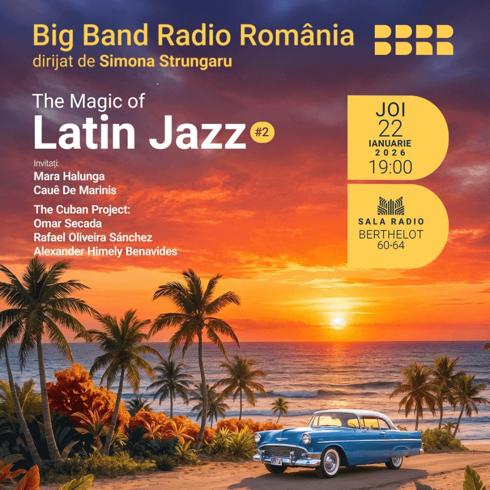 The Magic of Latin Jazz - BIG BANDUL RADIO- Simona StrungaruJoi, 22 ianuarie 2026, ora 19.00 BIG BANDUL RADIODirijor: Simona StrungaruThe Magic of Latin JazzCategoria I – 80 leiCategoria a II-a - 64 l