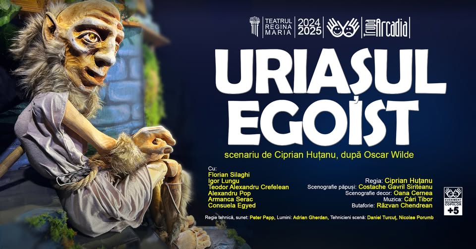 Uriașul Egoist este o poveste despre consecințele care apar când încercăm să ne izolăm de cei din jurul nostru, refuzând să înțelegem că doar ceea ce împărțim cu alții poate aduce adevărata împlinire. Spectacolul explorează teme profunde ale egoismului și ale transformării personale prin intermediul unei narative captivante. Piesa este o dramatizare cu scenariu de Ciprian Huțanu, după celebra povestea lui Oscar Wilde. Distribuția include actori talentați precum Florian Șilaghi, Igor Lungu și Alexandru Crefelean, care aduc viață personajelor cu o interpretare autentică și emoționantă. Spectacolul este prezentat de Teatrul Regina Maria din Oradea, una dintre instituțiile culturale de referință din oraș. Acest spectacol se remarcă prin abordarea sensibilă a unei povești clasice, păstrând spiritul original al operei lui Oscar Wilde, dar adaptând-o pentru publicul contemporan. Montarea oferă o experiență teatrală de calitate, cu decoruri și atmosferă care susțin mesajul profund al piesei despre importanța conexiunilor umane și a generozității.